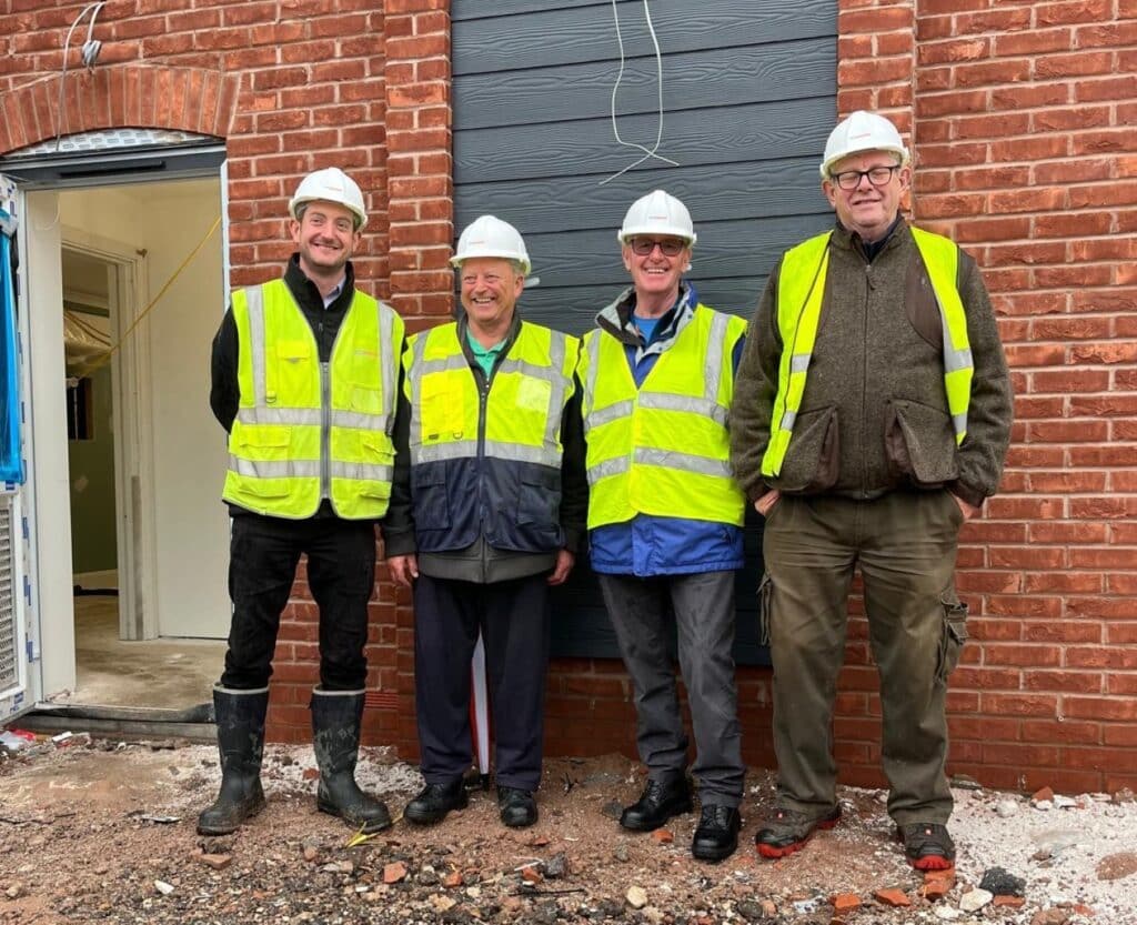 Councillor John Clark, Councillor Anthony Ball, Councillor John Billings (Chair) joined Site Manager Levi Chambers to place the final few roof tiles on Dovebourne.